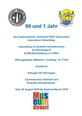 Anfangen möchten wir mit einer Sonderausstellung bei uns im Kirdorfer Heimatmuseum "99 und 1 Jahr CV Heiterkeit", und zwar schon dieses Jahr. Die Austellung ist jeden Mittwoch und Sonntag