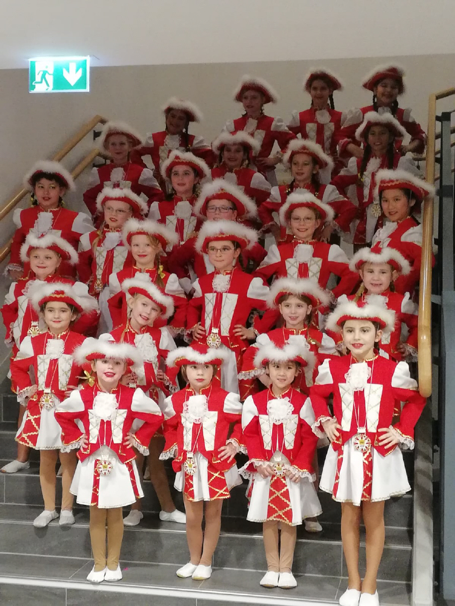 Bei uns tanzen zurzeit 15 Mädchen und Jugen im Alter von 5 bis 9 Jahren. Jedes Jahr studieren wir für unsere Faschingssitzungen und andere Auftritte einen Showtanz und einen Gardetanz ein. Auch für unsere Faschingseröffnung dem „11.11.“ lassen wir uns immer etwas Tänzerisches einfallen.